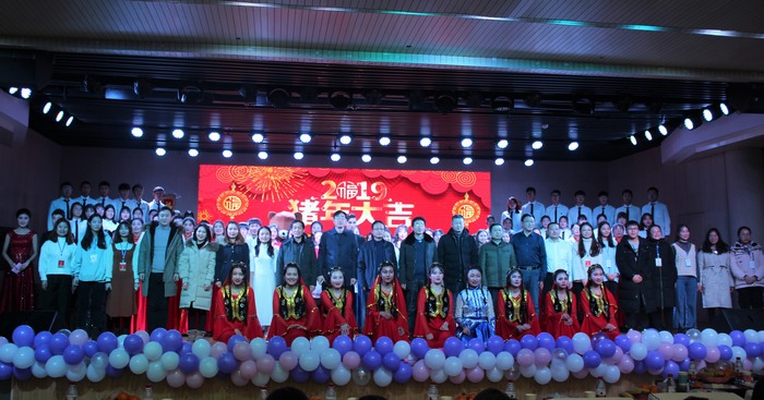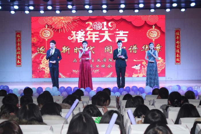 晚会开始前,院领导杨云善、唐国战等以VCR视频的形式总结回顾了2018年的工作,向全院师生表达了新年祝福。整场晚会将过去、现在、未来相串联,浪漫柔情与热情动感并存,流行文化与传统民族文化融合。活力满满的开场舞瞬间引爆全场,拉开了此次晚会的帷幕。轮滑表演和rap《友》使民族文化与现代元素激情碰撞,将晚会气氛瞬间点燃。小品《TFgirls》以诙谐的语言和动作引得在场观众捧腹大笑,向我们传达了追逐梦想不惧失败的深层意义。歌曲串烧《歌声飘过四十年》和舞蹈串烧《民族大团结》以悠扬的歌声和曼妙的舞姿,表达出对改革开放四十年的巨大变化的感慨和中华民族各族儿女对实现中国梦的期待。我院党政领导班子与学生代表共同朗诵的《改革开放四十周年颂:中国奇迹》,饱含深情地歌颂出改革开放后中国特色社会主义建设所取得的伟大成就,将对祖国壮丽山河、对明天的希冀融在诗句中,表达出身为中华儿女的骄傲与自豪。整场晚会气氛高涨,高潮迭起,其中穿插的微信抽奖互动环节和“马院锦鲤”的抽选更加丰富了本场晚会的内容。最后,晚会在新时代合唱团的大合唱《在灿烂的阳光下》中落下帷幕。