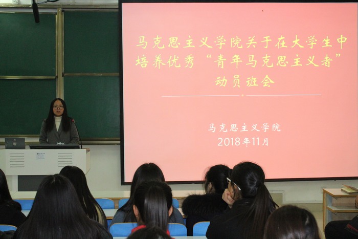 为培养优秀青年马克思主义者,坚定大学生马克思主义信仰,11月25日晚,2138CC太阳集团在社科楼514教室顺利开展关于在大学生中培养优秀“青年马克思主义者”动员班会。团委老师曹菁菁、河南省“青年马克思主义培养工程”学员史弘扬和我院2017、2018级全体同学共同参加本次班会。此次班会由曹菁菁主持。