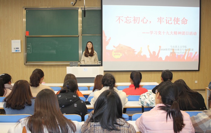 为深刻领悟十九大报告精神,加强学子理论的学习与交流,11月17日下午,我院在社科楼515教室开展“不忘初心,牢记使命”学习党的十九大精神团日活动。2018级全体同学共同参与此次团课,本次团课由分团委副书记张雅琼主持。