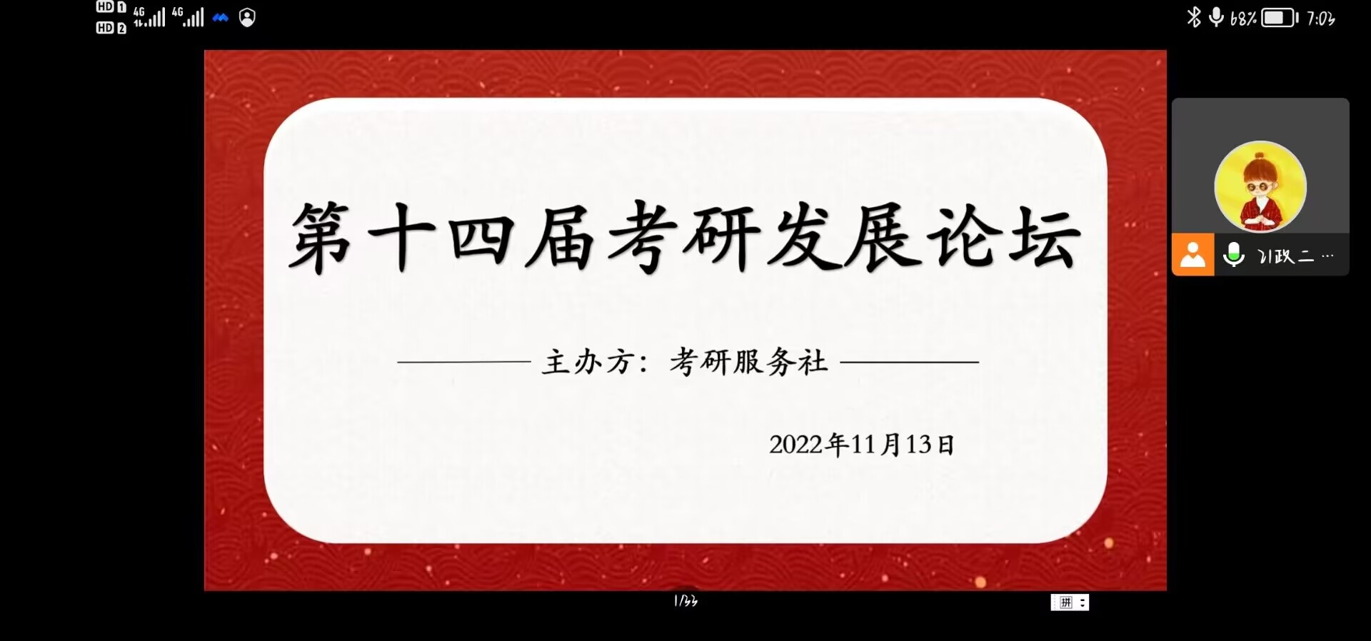 功不唐捐,玉汝于成。11月13日晚上,由2138CC太阳集团考研服务社组织的第十四届考研发展论坛在线上顺利举行。聚星文登考研指导老师吕明明、校学生会社团部及百名学子共同参加本次论坛。活动由朱钰阁、李雪静主持。