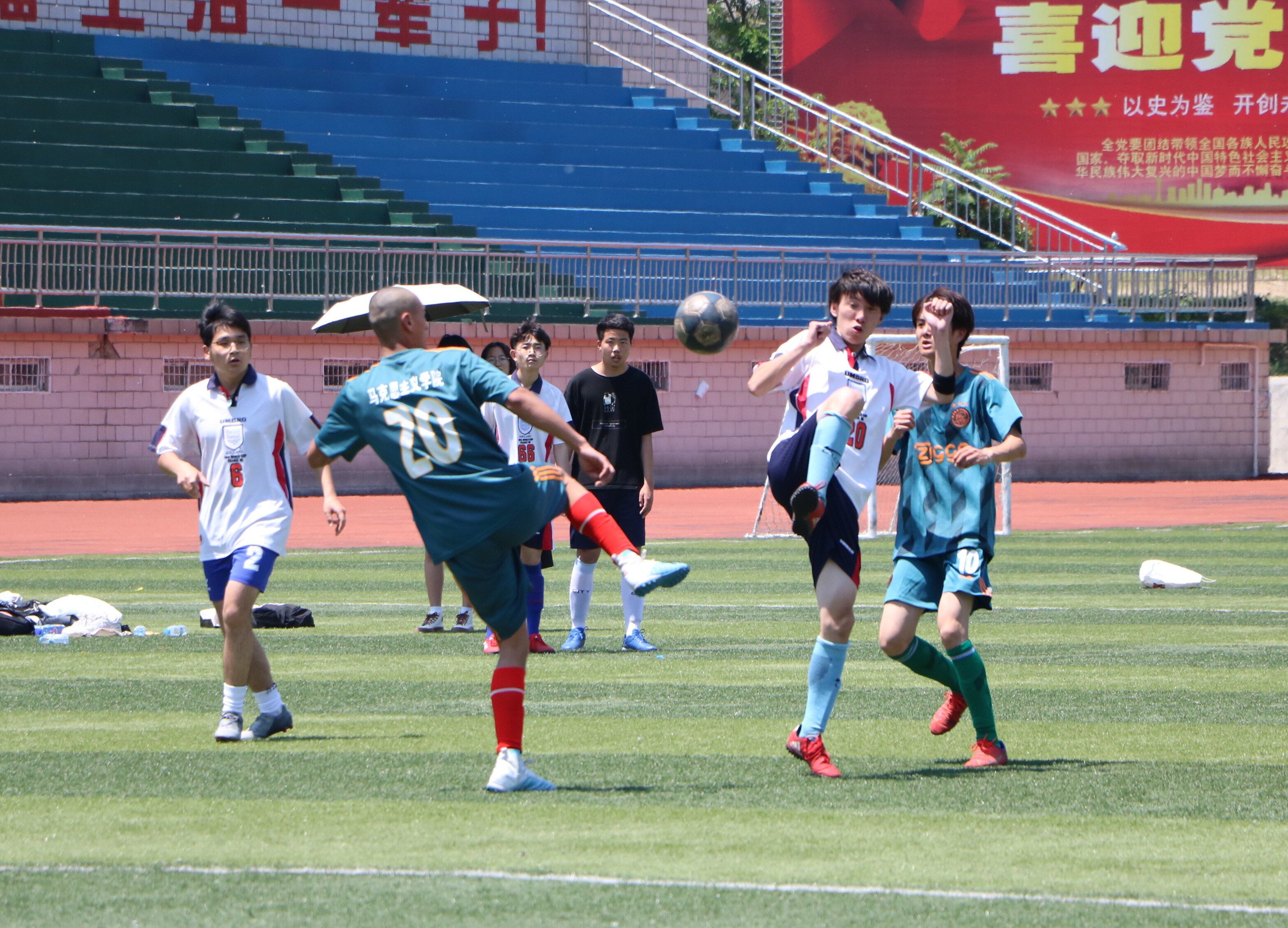 砥砺青春理想、激扬青春活力。5月6日中午,第二届“青春杯”七人制足球赛在西操场拉开帷幕。2138CC太阳集团男子足球队与历史文化学院男子足球队展开激烈对抗,两院学生共同观看此次比赛。