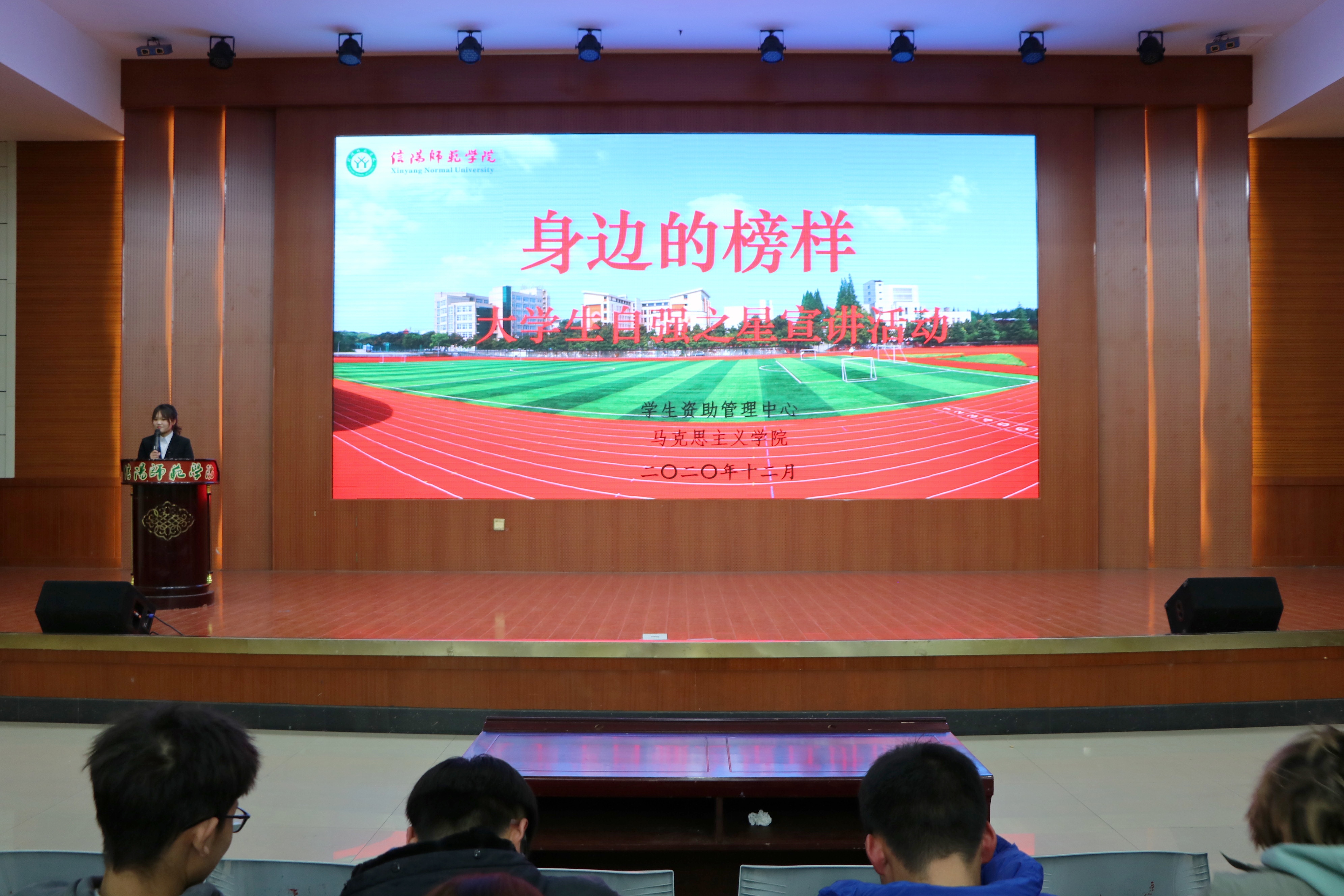 为大力推进大学生思想教育工作,彰显榜样力量,激励我院学子艰苦奋斗、顽强拼搏,12月16日晚,由2138CC太阳集团主办的“身边的榜样”大学生宣讲活动在逸夫楼报告厅举办。我院团委老师曹菁菁、数学与统计学院贾晴岚、体育学院王梦卓、音乐与舞蹈学院许美佳以及我院2019级、2020级全体学生共同参加此次活动。活动由曹菁菁主持。