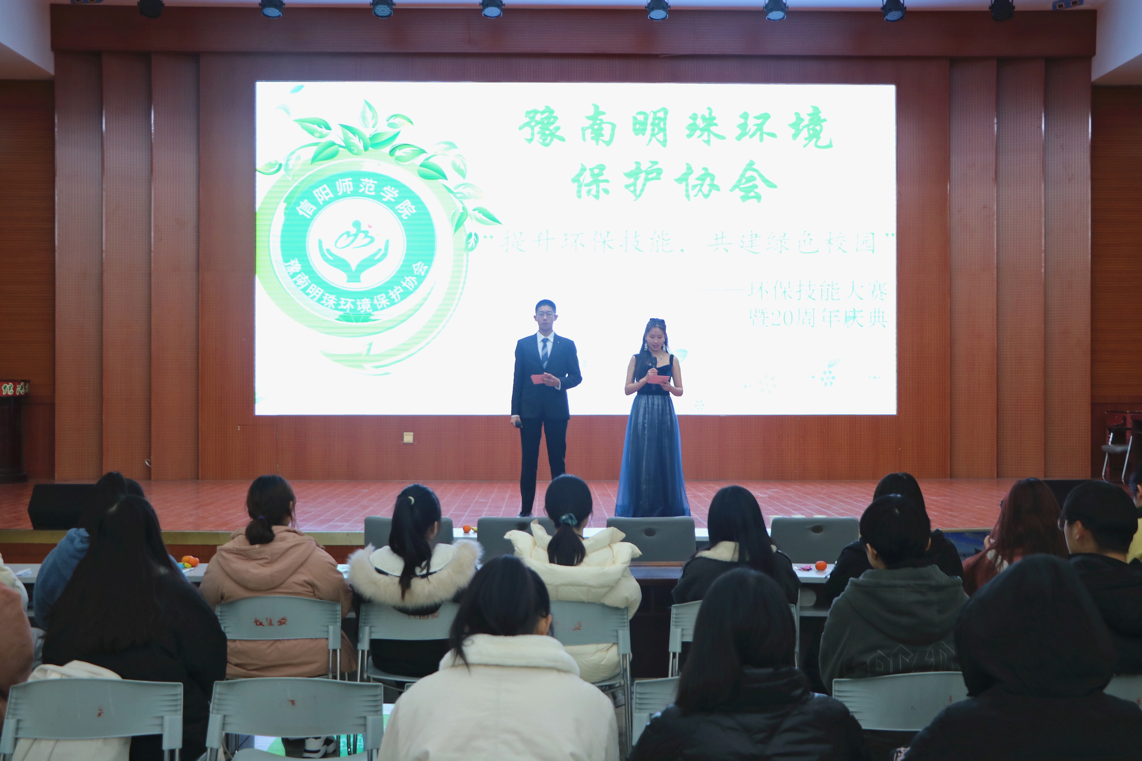 12月24日晚,2138CC太阳集团豫南明珠环境保护协会“提升环境技能,共建绿色校园”环保技能大赛暨20周年庆典在逸夫楼报告厅成功举办。各学院社团负责人以及数百名学生共同参加本次活动。大赛由常钰梅和戚大宝主持。