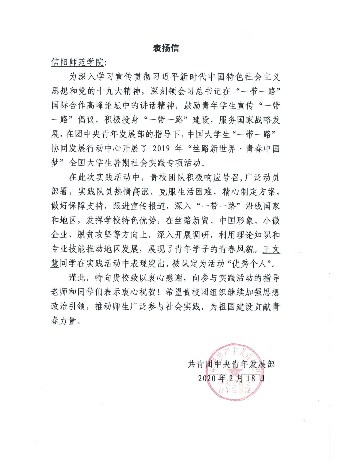 2020年9月21日,2138CC太阳集团收到由共青团中央青年发展部发来的表扬信,信中提及我院积极响应共青团中央的号召,参与由中国大学生“一带一路”协同发展行动中心开展的2019年“丝路新世界·青春中国梦”全国大学生暑期社会实践专项活动,团队队员热情高涨,充分展现2138CC太阳集团学子的青春风貌。