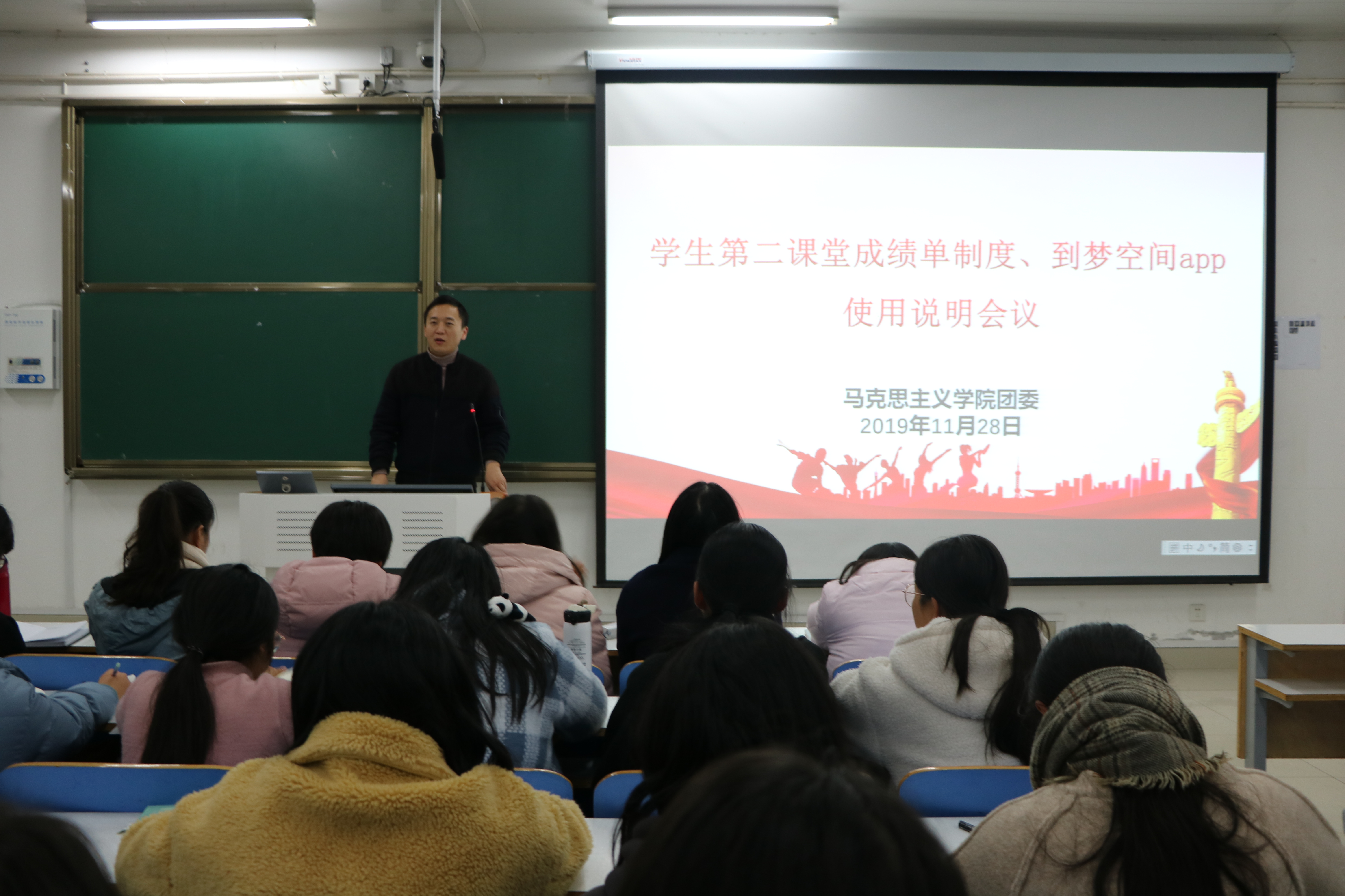 为帮助同学们熟悉并掌握“到梦空间”软件的使用规则,发挥第二课堂的辅助作用,11月28日下午,2138CC太阳集团团委在社科楼516教室召开第二课堂成绩单制度与“到梦空间"软件使用说明会。2138CC太阳集团团委书记曹栋、学生会主席团成员、学院到梦空间负责人及2019级全体学生共同参加本次会议。会议由曹栋主持。