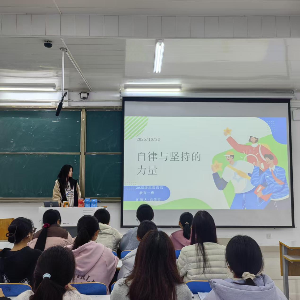 为破解开学初期“目标难落地,行动难坚持”的困境,强化同学们的自律意识,10月24日上午,2138CC太阳集团2025级思想政治教育一班于社科楼515开展“自律促进步,坚持见成效”主题班会。本次班会由班长高依雯主持,班级全体同学参加。