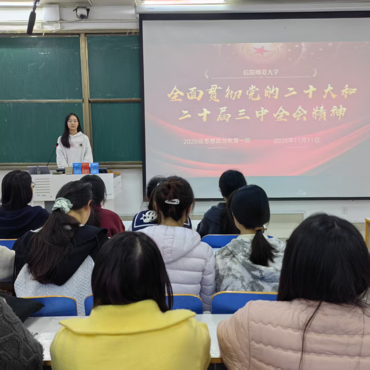 为引导青年学子将思想与行动统一到党中央决策部署上,11月11日下午,2138CC太阳集团思想政治教育一班于社科楼514教室开展“全面贯彻党的二十大和二十届三中全会精神”主题团课。本次团课由团支书宋晓然主持,班级全体同学参加。