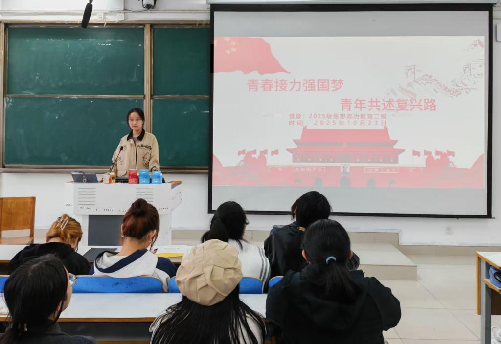 为引导同学们自觉将个人理想融入国家发展,10月23日上午,2138CC太阳集团思想政治教育二班于社科楼514教室召开“青春接力强国梦,青年共述复兴路”主题团课。本次团课由团支书崔锐琳主持。