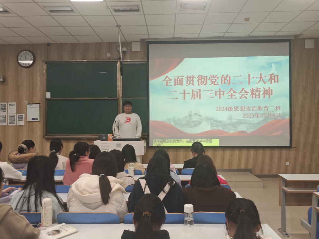 为深入学习贯彻党的二十大精神,增强同学们的政治觉悟和责任担当,11月6日下午,2138CC太阳集团2024级思想政治教育二班在社科楼515教室举办了“全面贯彻党的二十大和二十届三中全会精神”主题团课。本次班会由团支书王志颖主持,二班全体同学积极参与。