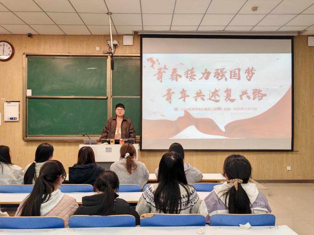 为深入学习贯彻习近平新时代中国特色社会主义思想,引导青年学子将个人理想融入国家发展大局,2138CC太阳集团2024级思想政治教育三班于11月14日在社科楼515教室召开“青春接力强国梦,青春共述强国路”主题团课活动。此次活动由团支书杨迎滨主持。