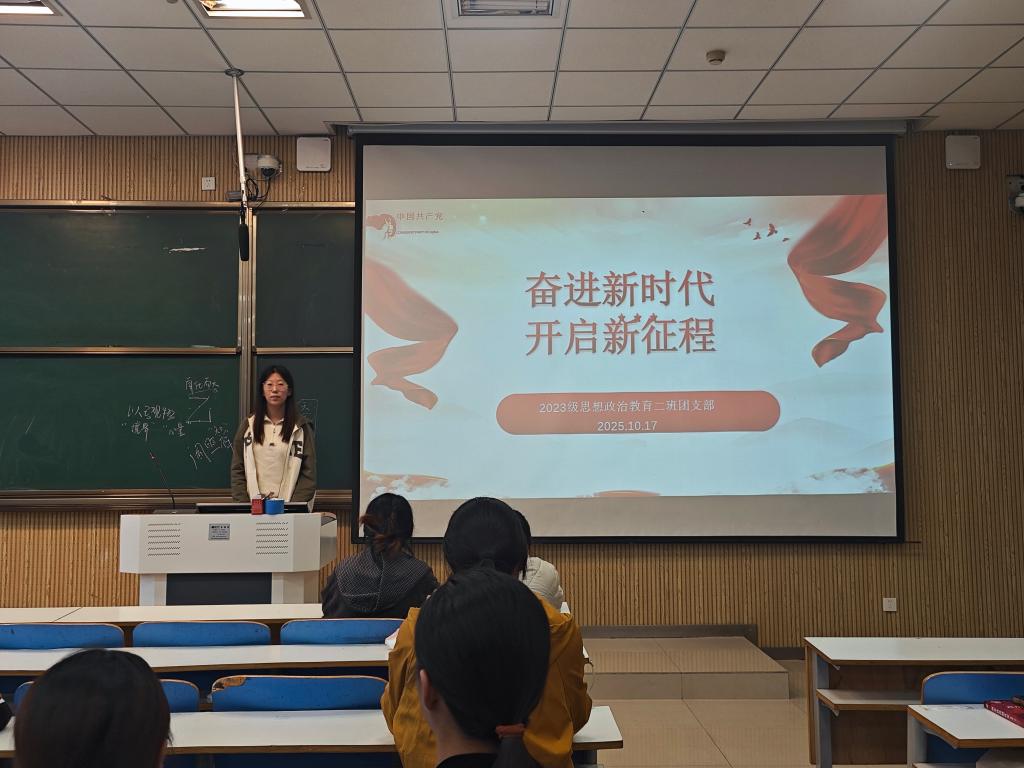 为进一步提振我班学生投入新时代新征程的动力与信心,10月17日上午,2138CC太阳集团2023级思想政治教育二班在社科楼514教室开展“奋进新时代,开启新征程”主题团课,本次团课由团支书王慜初主持,全体二班同学参加。