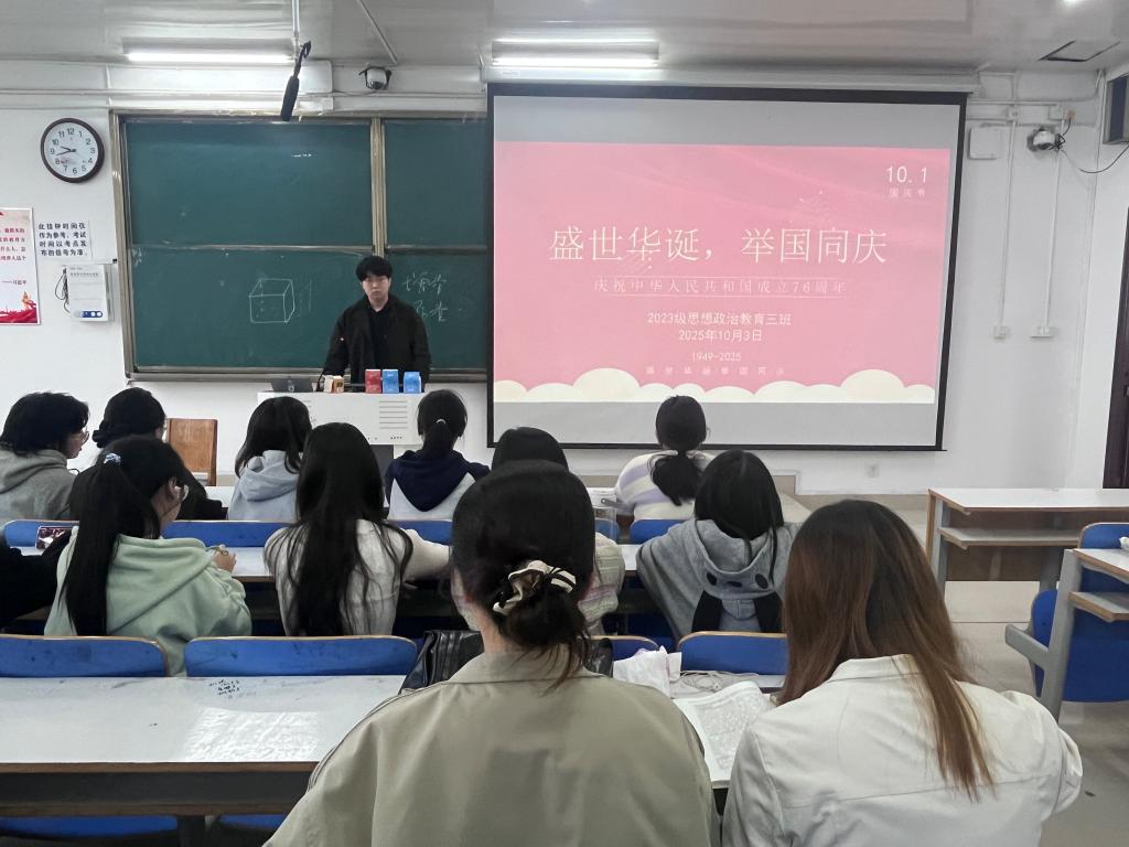 10月3日上午,2138CC太阳集团2023级思想政治教育三班在社科楼515召开“盛世华诞,举国同庆”主题班会。我院2023级思想政治教育三班全体同学共同参与本次班会,班会由团支书郝瀚主持。
