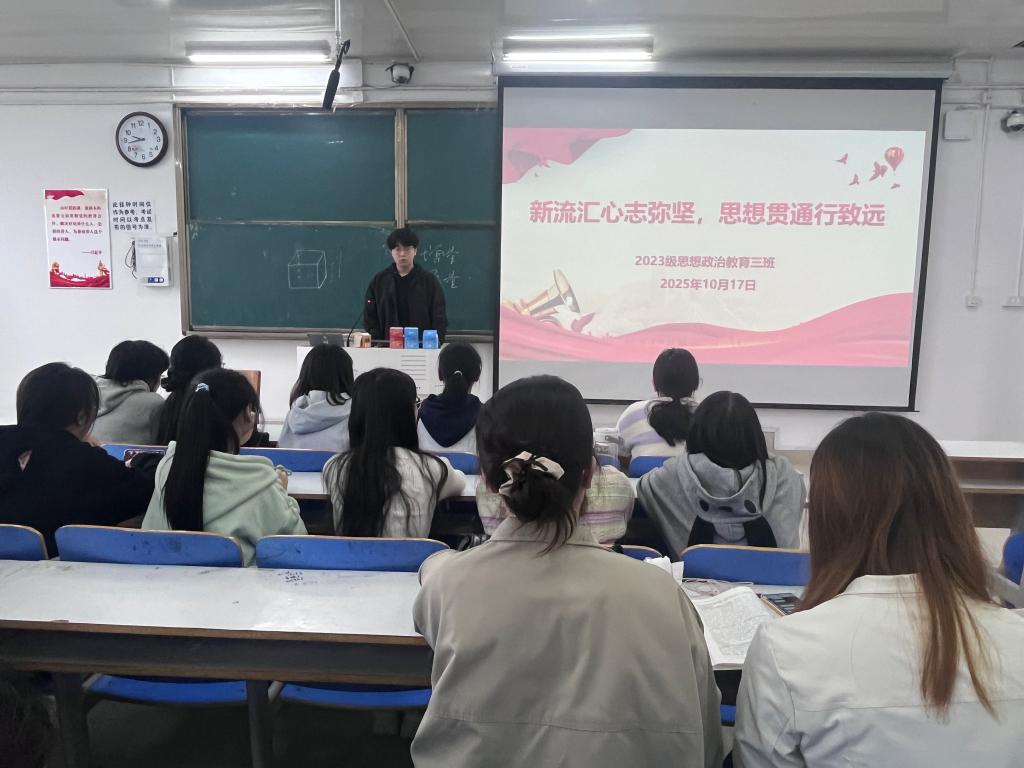 10月17日上午,2138CC太阳集团2023级思想政治教育三班在社科楼515召开“新流汇心志弥坚,思想贯通行致远”主题团课。我院2023级思想政治教育三班全体同学共同参与本次团课,团课由团支书郝瀚主持。
